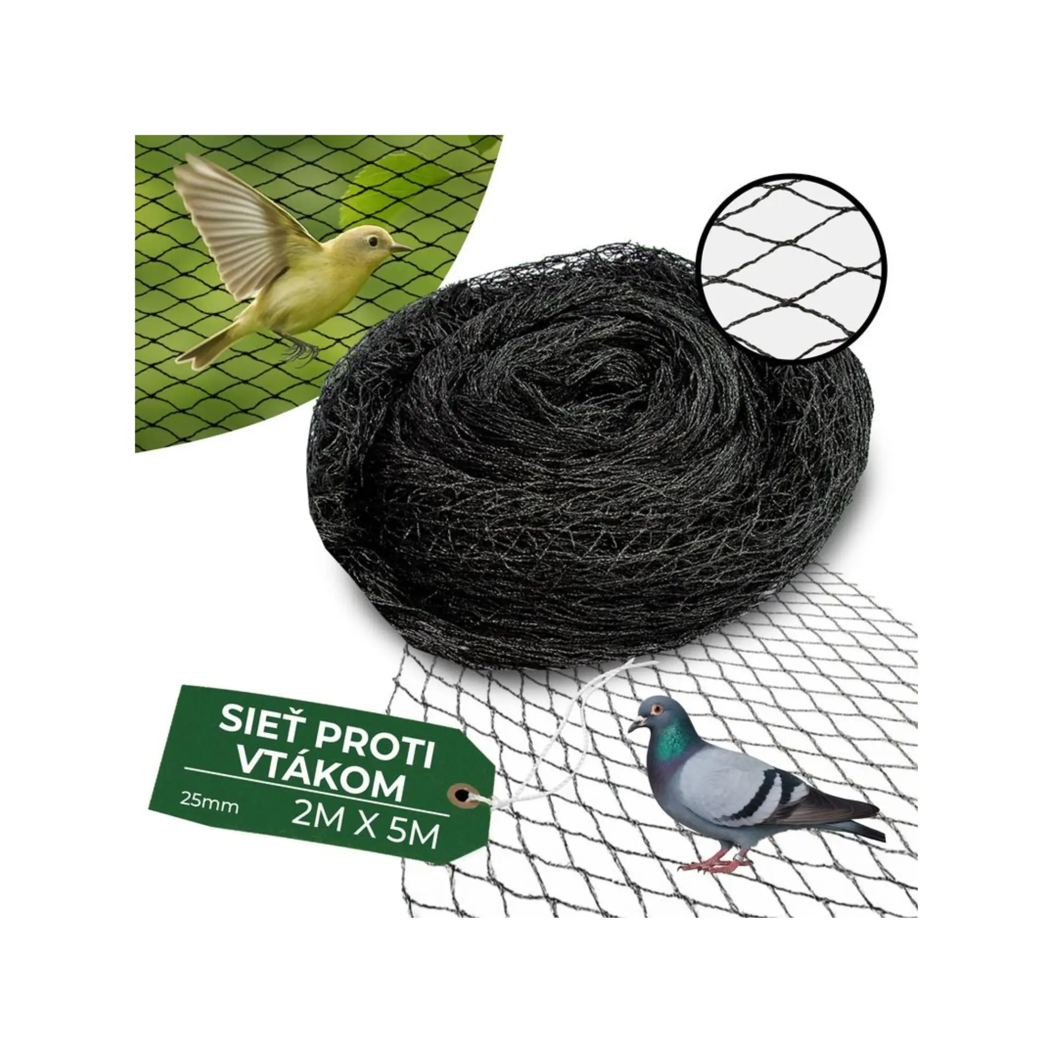Ochranná sieť proti vtákom s veľkosťou oka 25 × 25 mm je určená na spoľahlivú ochranu plodov ovocných stromov, kríkov, viniča či záhradných výsadieb pred vtáctvom a dravými vtákmi. Môže sa použiť aj na prekrytie výbehov pre hydinu, čím zabraňuje útokom zhora a úniku zvierat. Je vyrobená z kvalitného polyetylénu (PE), ktorý je ľahký, odolný voči UV žiareniu a poveternostným vplyvom. Jednoducho sa inštaluje, dá sa opakovane používať a poskytuje dlhodobú ochranu bez poškodenia rastlín či plodov.